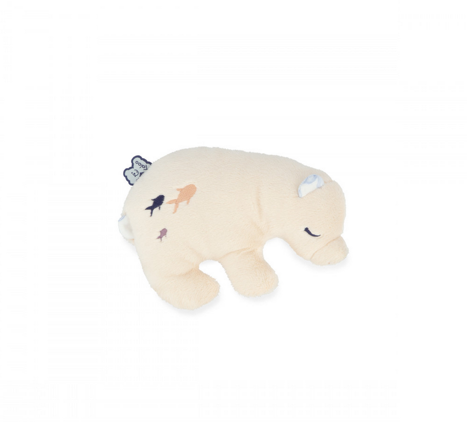 Son dos est rehaussé d'un imprimé « Danse des vagues » et son ventre de broderies de poissons multicolores, qui rappellent le calme des profondeurs marines et l'onde de douceur et de bien-être apportées par la peluche bien-être. Sans poche, elle s’utilise aussi très bien comme peluche câlin. C'est la peluche bouillotte préférée de bébé !